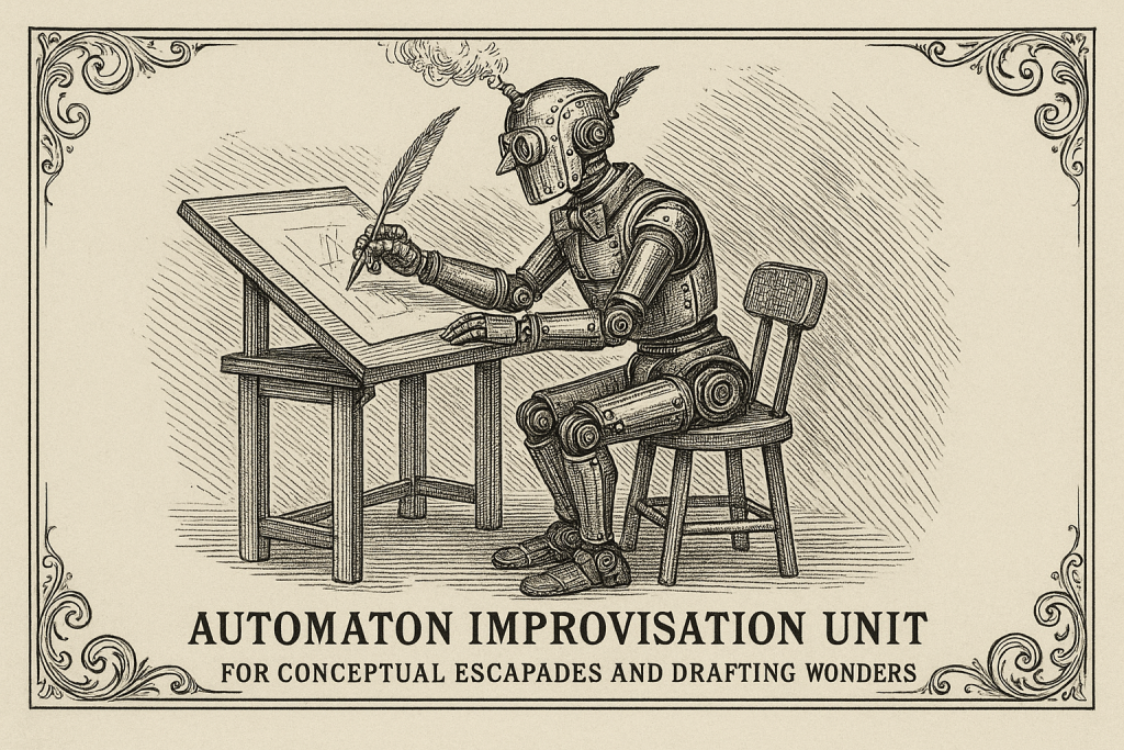 The title below the image reads “AUTOMATON IMPROVISATION UNIT,” with the subtitle “FOR CONCEPTUAL ESCAPADES AND DRAFTING WONDERS.” This text is the key to the meme’s meaning. While “automation” usually suggests rigid, repetitive tasks, the phrase “improvisation unit” implies the opposite—spontaneous, creative, and non-prescriptive action. The “conceptual escapades” and “drafting wonders” further reinforce this idea of the automaton as a creative partner, not a mindless tool.