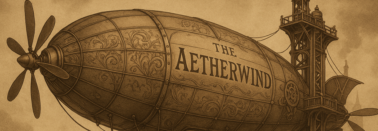 The visual echoes Victorian London — sepia tones, ornate signage, passengers in top hats and goggles — while incorporating whimsical anachronisms like steam-powered air travel replacing underground trains. The signage uses the historical Æ ligature in “Æther,” a nod to 19th-century typography and science-fiction sensibilities. It’s a playful mix of British transport humour, vintage aesthetics, and alternative history, fitting perfectly into the Steampunk Composure Protocol spirit of handling modern irritations with style.